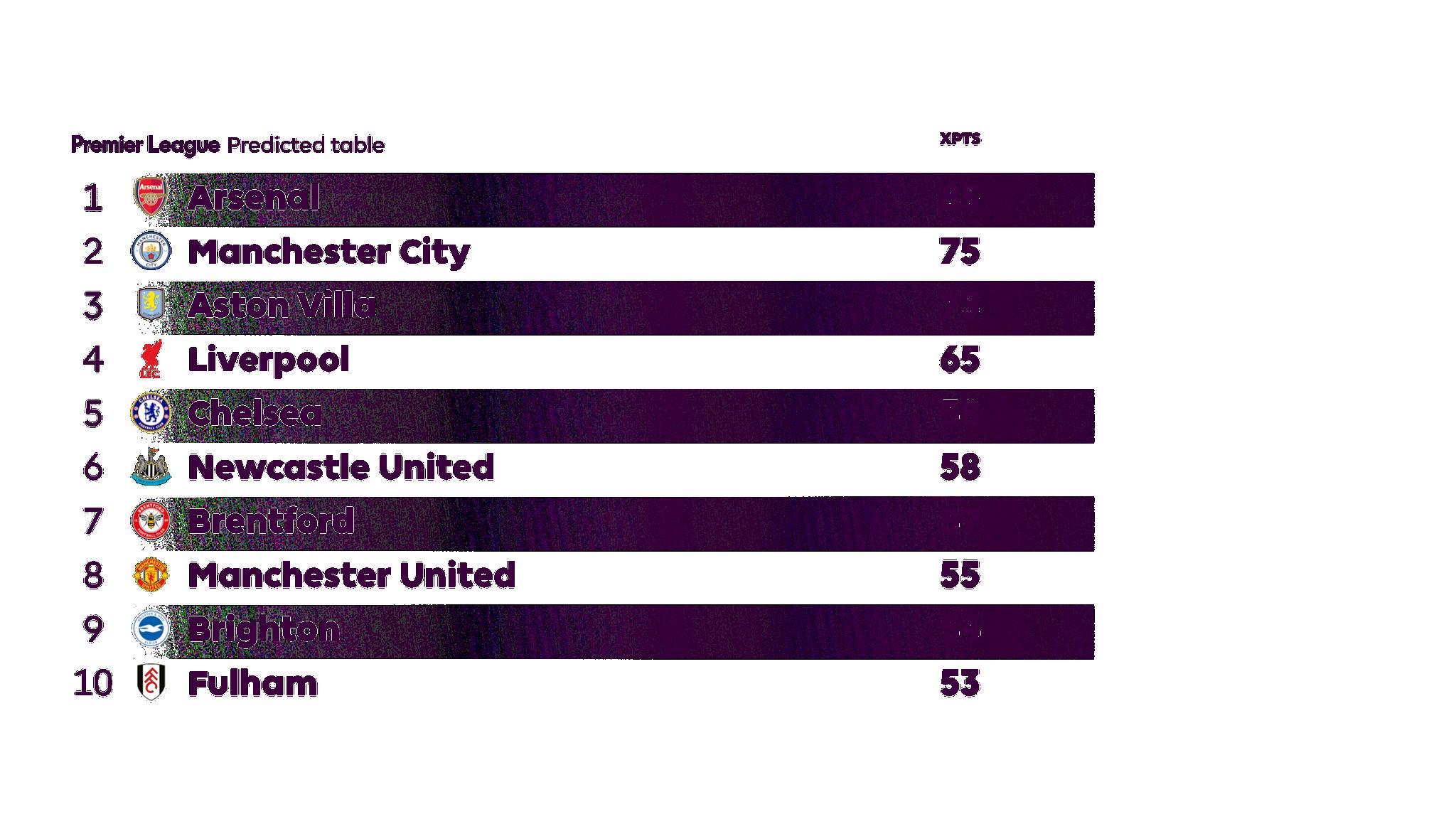 根据预期积分计算得出的英超联赛预测积分榜